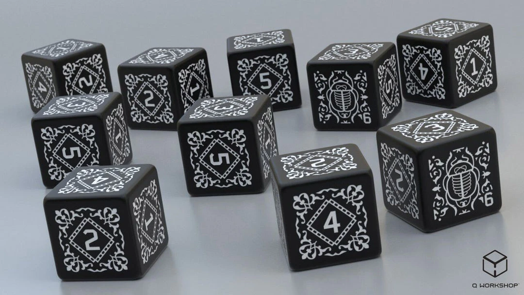 A set of 10 engraved custom dice, designed specifically for the Coriolis – The Third Horizon roleplaying game. These dice support the game mechanics of Coriolis, but can also be used as normal six-sided dice for any game.