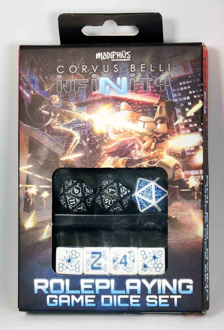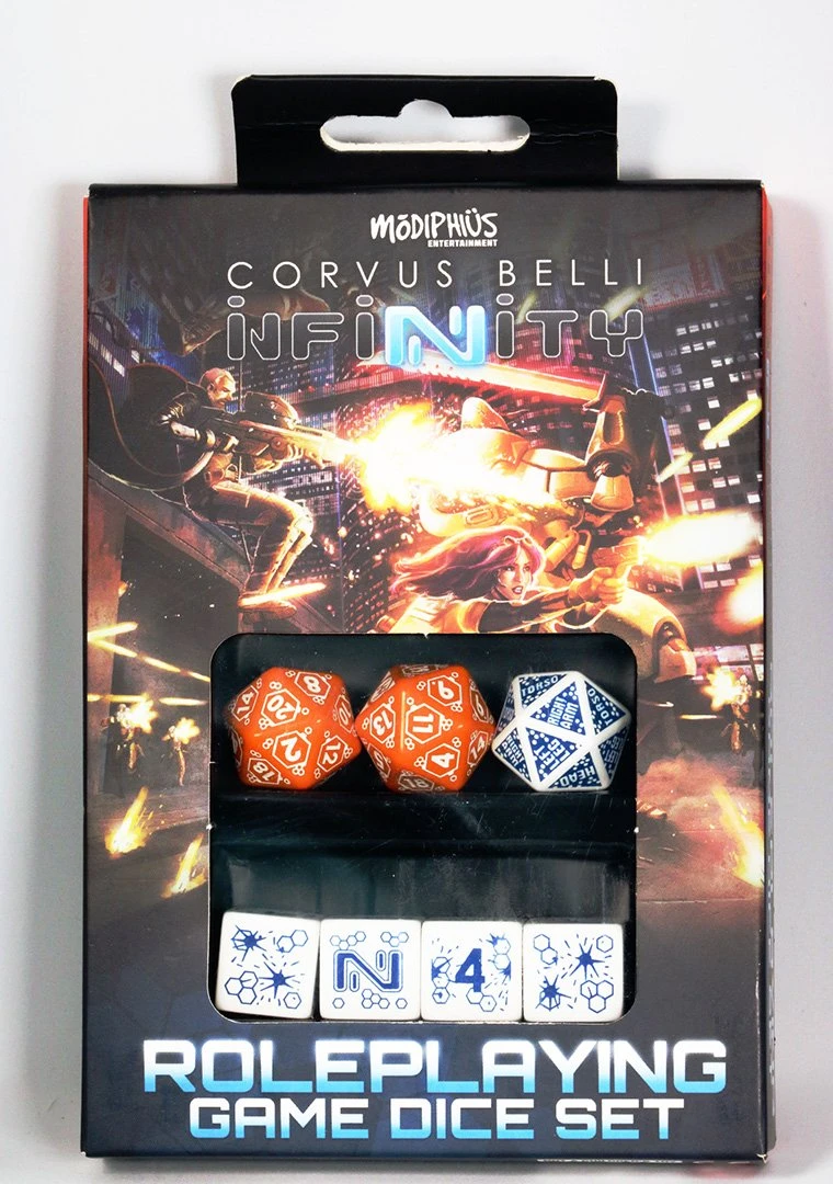 Boxed dice sets for the Infinity Roleplaying game, each containing: