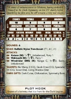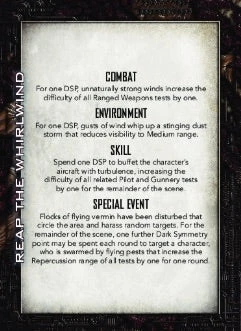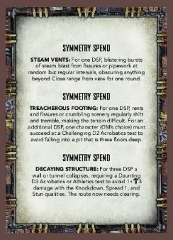 The obverse side of each card is printed with an image that can be presented to the players, along with a brief description that will help the GM tailor the effects to a specific location, while the reverse side provides three Dark Symmetry spends of increasing severity, that can be used to taunt and terrorise the players during the current encounter.