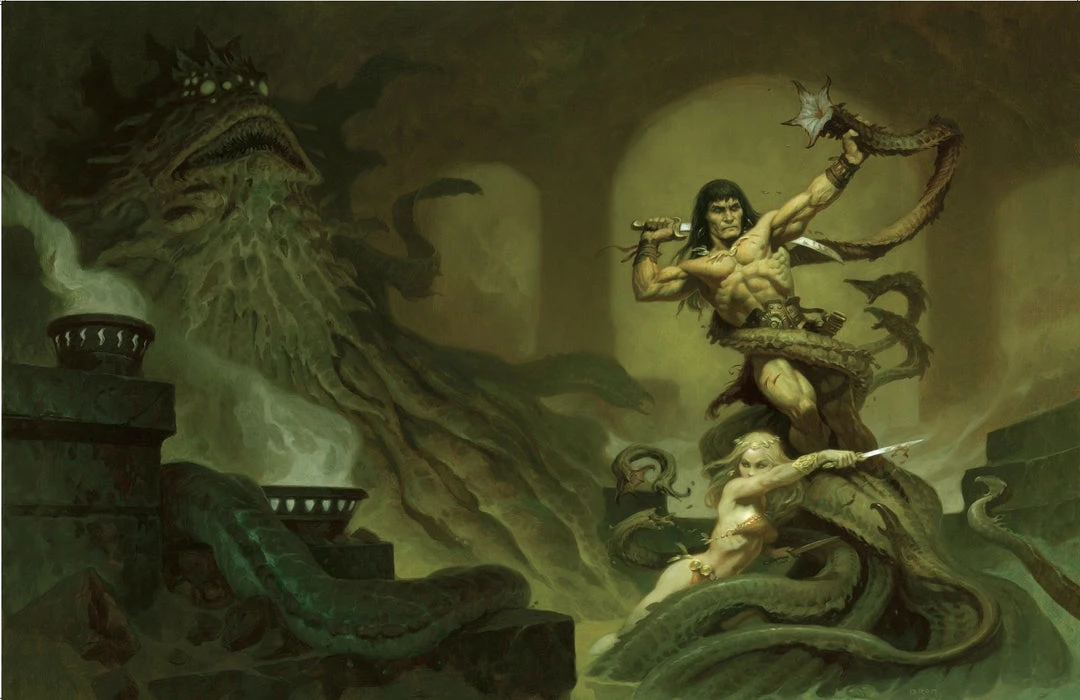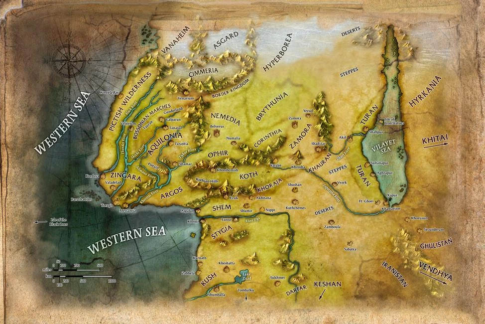 This double PDF poster pack features two fantastic posters, the Adventure map and the Hyborian Age map. The Adventure map features a poster of jungle ruins and a forbidden temple, while the Hyborian Age map, features all the nations in the Hyborian age with the reverse showing the cover art of the core book by renowned fantasy artist Brom.